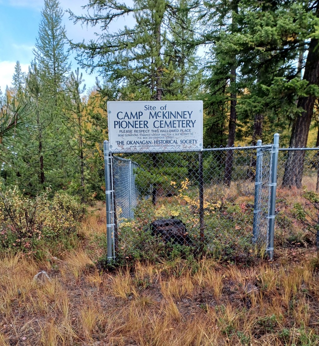 Residents of the Camp McKinney cemetery should include Mathew Roderick, the man who robbed the gold shipment in August of 1896 and was killed in October as he returned to retrieve most of the bullion. In fact, he was buried twice after two separate autopsies and his location is unknown. The two fenced graves are Morris and Galloway from 1950.