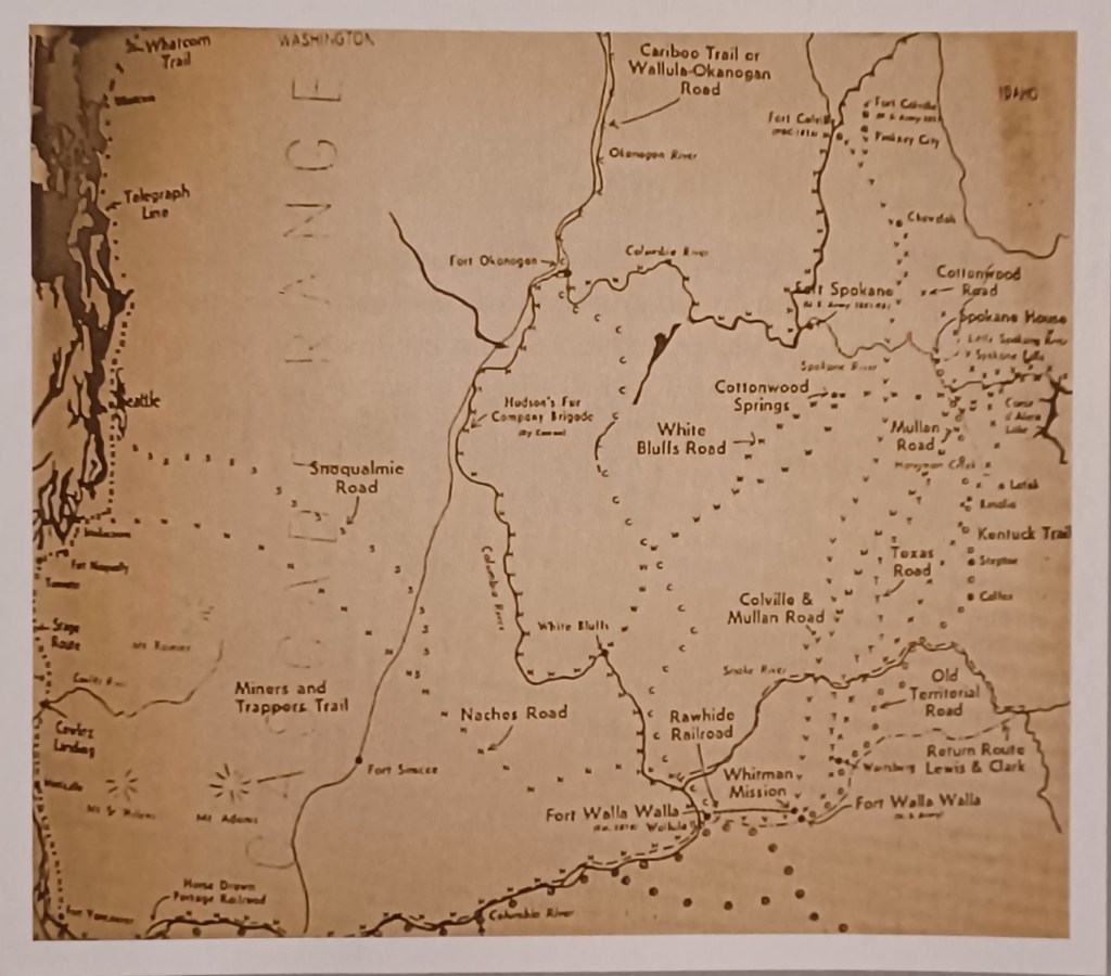 Chasing Stolen Gold contains a few rare gems of information and this map certainly falls into the category. The creator is unknown but Jackie Franks discovered it and donated it to the Clayton/Deer Park Historical Society in Clayton, Washington. The map is a virtual treasure trove of historic routes, trails, and forts. The accuracy appears good and it’s interesting to note that the return route of the Lewis and Clark Expedition was still known. Also marked is the Rawhide Railroad, a thirty mile line connecting two communities. According to the author of a book by the same name published in 1916, George Estes, two steam locomotives were shipped around the horn and used on railway tracks made of wood and covered with rawhide to minimise wear from the heavy trains. The story goes on to say that the system worked well until a severe winter when starving wolves ate the rawhide strips. (That’s a great way to end a story).